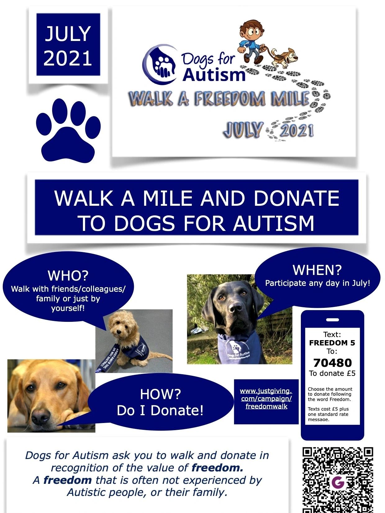 This year we are asking you to walk and donate in recognition of the value of freedom. A freedom that is often not experienced by many autistic people, or their family.Having a Dog for Autism as a partner can open up freedom to the world for these individuals and families.